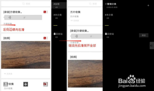 分类办理:当我们收集的内容增多时,就需要对这些内容进行分类,以便更好的进行办理。从页面左侧边缘标的目的右滑动,就可以打开“办理分类”页面。这个页面可以睁开一半,或者全数睁开。