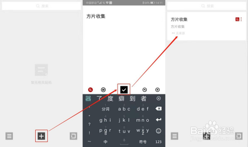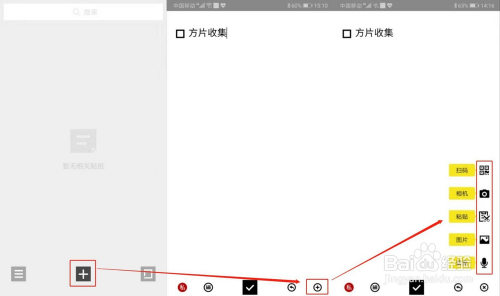 快速收集:点击中心的“+”号,输入内容,点击“√”号,一条贴纸就建立完当作了,就是这么简单,这么快速。(在方片收集中,每一条建立/收集的内容都叫做贴纸)