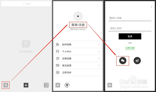 多端同步:要利用方片收集的多端同步功能,需要先登录。点击左下角的三横图标,再点击【登录/注册】,方片收集撑持账号密码登录和微信、微博登录。此处我选择微信登录。
