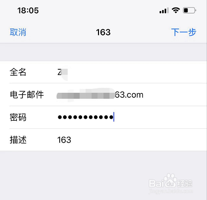 输入你的邮箱账号和邮箱密码,全名可以随便输几个字母取代,然后点击“下一步”;