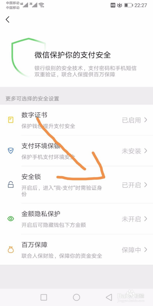 第五步,点击平安保障之后,就会来到微信庇护你的支付平安,点击《平安锁》就是开启你的平安锁。