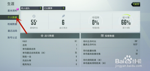 然后我们点击左侧的小我数据选项,可以看到我们游戏的根基环境,以及战绩的阐发,如图所示。