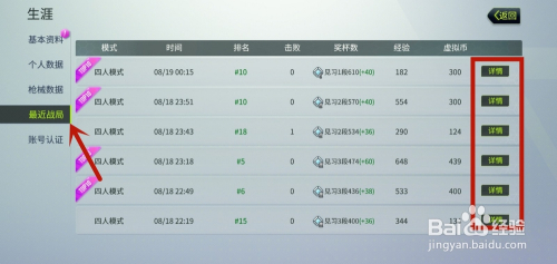 然后我们点击左侧的比来战局选项,可以看到每一局的汗青数据环境,我们点击后面的详情按钮,如图所示。