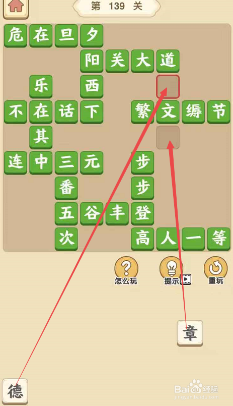 将“德”填在“道”之下,将“章”填在“文”之下,构成当作语“道德文章”。