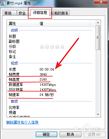 退出PR窗口,找到原始素材地点的文件夹,在视频素材上右键——属性——具体信息下查看。