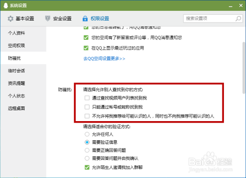 在放骚扰中若是许可别人查找到我的体例全数没有勾选的话,对方发送给我们的验证是收不到的,所以让对方更改下设置。