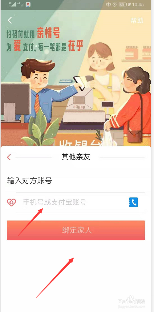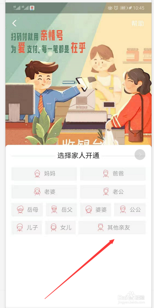 选择关系好,这里输入对方的账号,然后点击绑定家人按钮,然后设置支付金额的规模,输入指纹验证即可
