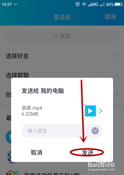 在确认发送页面,单击“发送”,在电脑上就可以保留下录制的视频了