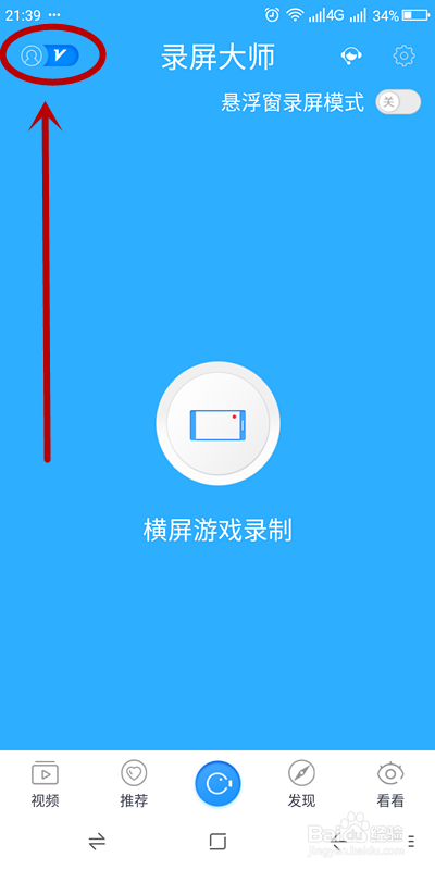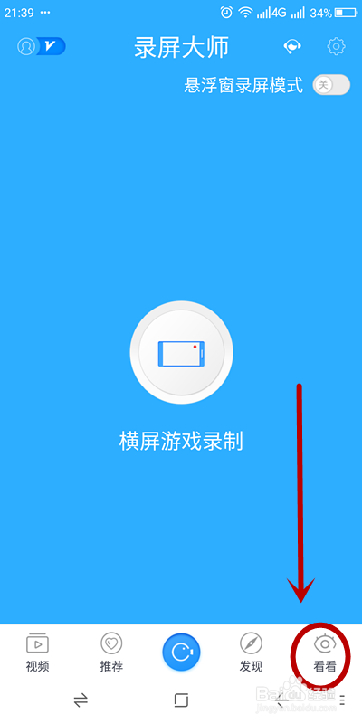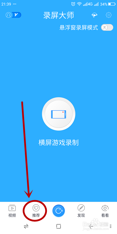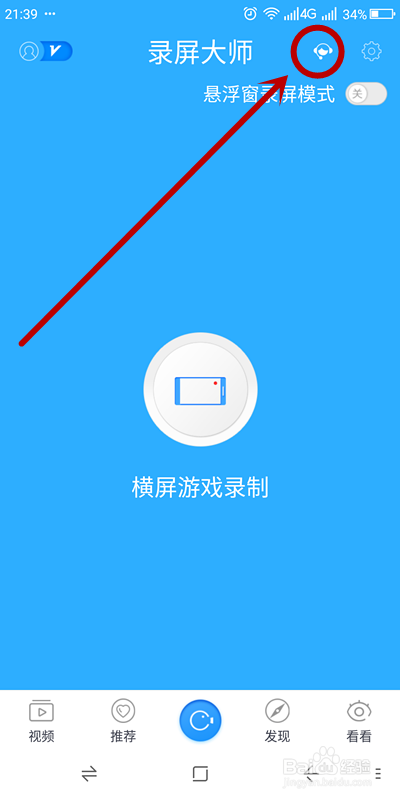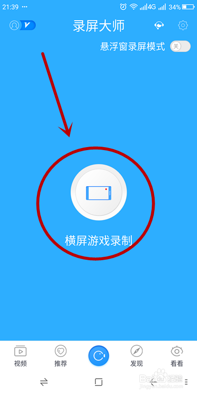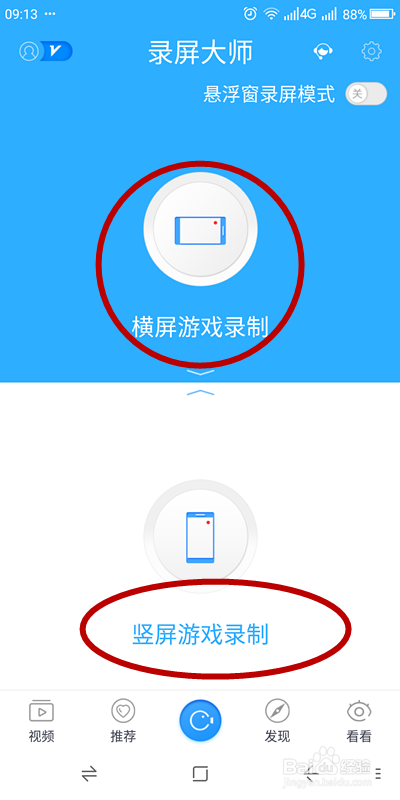 下面我们回到本家儿界面,看看软件本家儿要功能如何利用。我们可以按照本身录制的而需要在本家儿界面上下滑动,单击“横屏游戏录制”或者“竖屏游戏录制”按钮,选择分歧的录制形式