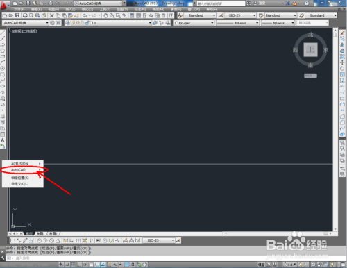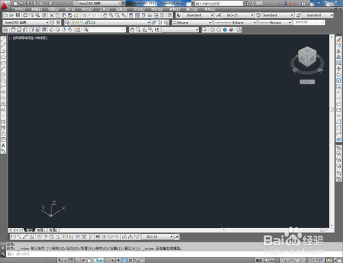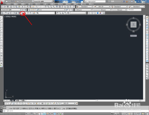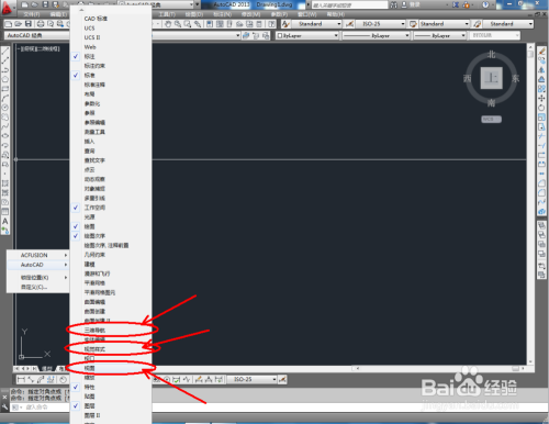 打开AutoCAD 2013软件,鼠标移动到图示区域,点击鼠标右键-【AutoCAD】,勾选【视图】、【视觉样式】和【三维导航】,将这三个东西栏调出并按图示调整好东西栏的位置;