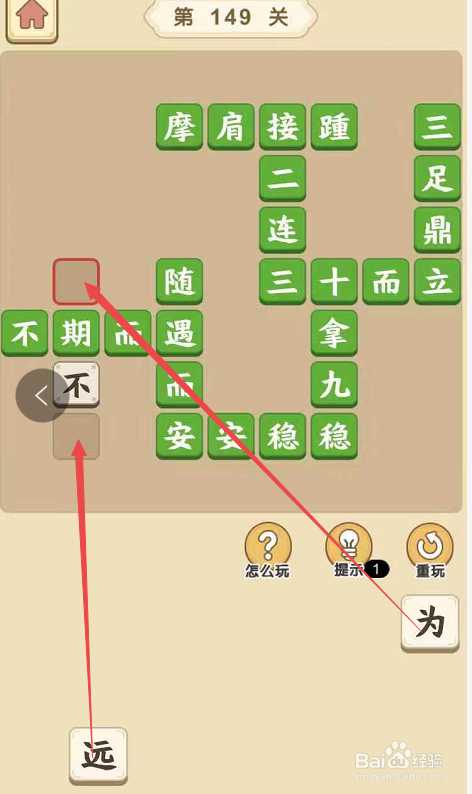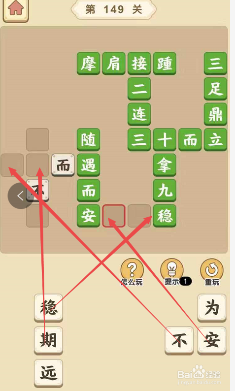 将”安“填在底部的”安“右侧,将”稳“填在底部的”稳“左侧,构成当作语”安平稳稳“,然后将”不“”期“填在”而遇“二字,构成当作语”萍水相逢“。
