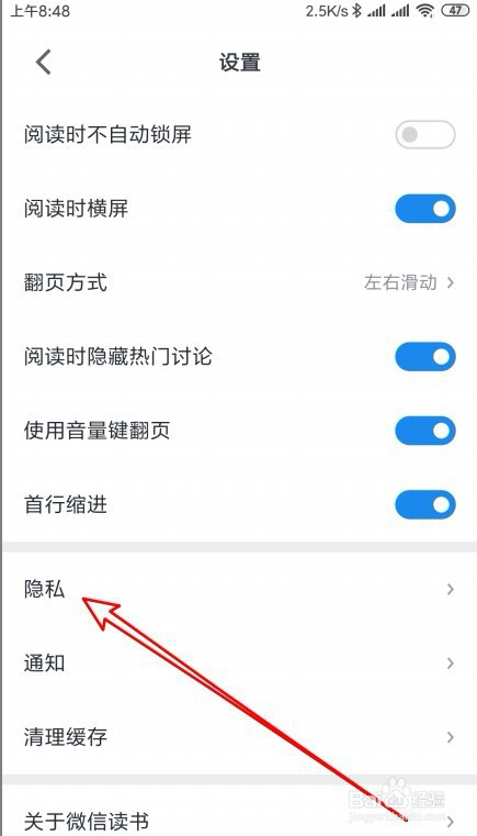 这时就会打开微信念书的设置页面,在页面中找到隐私的菜单项。