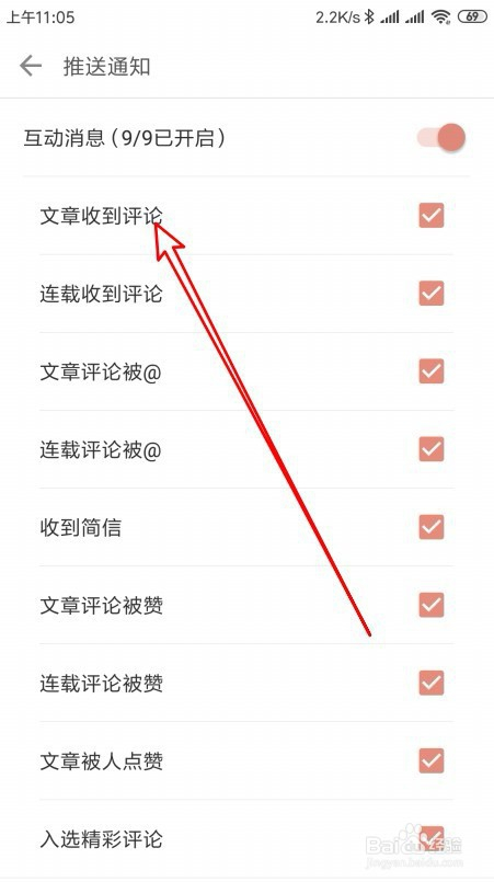 在打开的推送通知页面中,找到“文章收到评论”的设置项。