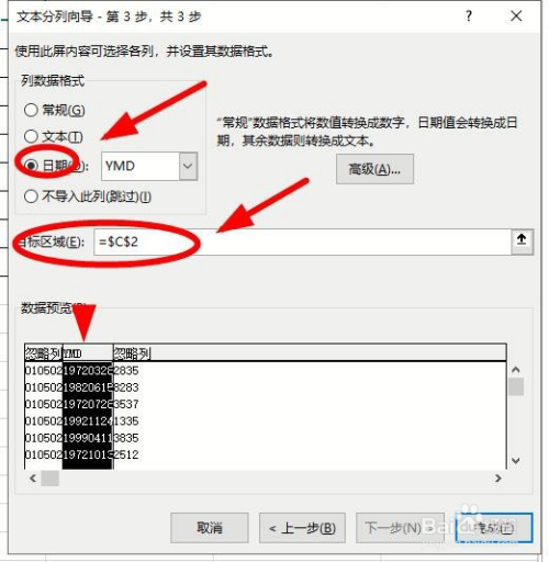 到“文天职列标的目的导-第2步”,别离在“数据预览”下的身份证号码的第6位和第7位之间、第14位和15位之间单击(身份证号码中的出生日期就在第7-15位),完当作后,单击“下一步”