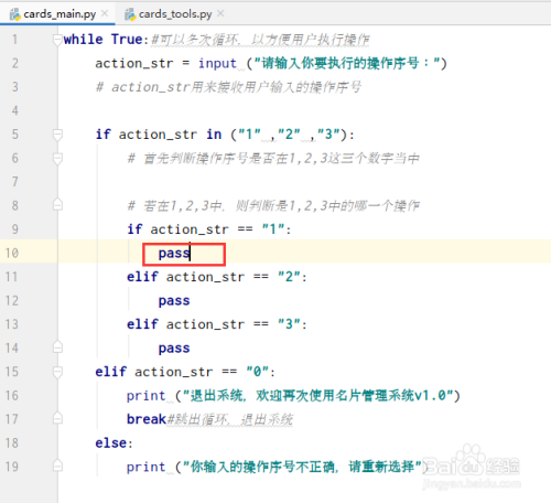 首先,将系统框架写在while轮回体内,以便利用户多次利用,若没有轮回体则执行操作序号一次退出一次。当用户选择“1”序号时,执行添加手刺操作;当用户执行选择“2”序号时,执行显示所有手刺操作;当用户选择“3”序号时,执行查询手刺操作;(pass一般作为占位符或者建立占位程序,pass语句不会执行任何操作,在这里是为了便利测试,后续会删除失落)当用户选择“0”序号时break则退出while轮回体,若不是以上操作序号则提醒用户犯错,从头选择。注重:break轮回体中的位置