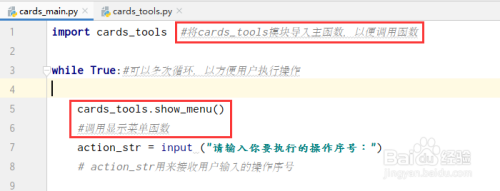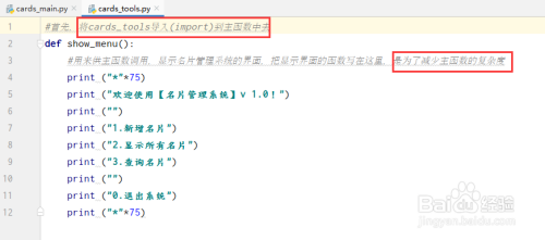 在cards_tools函数中写入显示菜单的函数,并在本家儿函数中导入cards_tools模块(菜单样式可以按照本身喜好设计,不惟一)