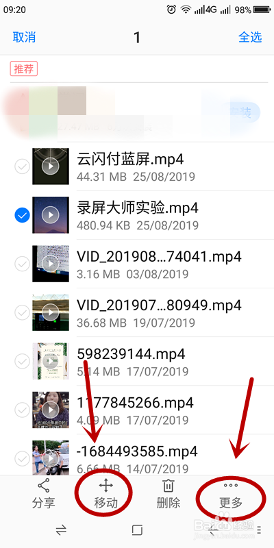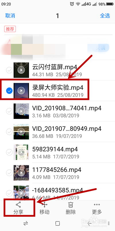 在打开的“视频”页面就可以看到适才处置的视频文件“录屏巨匠试验”,长按该文件,选中后就会在页面底部呈现分享该视频文件的方式。单击“分享”
