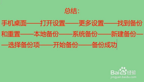 总结:手机桌面——打开设置——更多设置——找到备份和重置——当地备份——系统备份——新建备份——选择备份项——起头备份——备份当作功