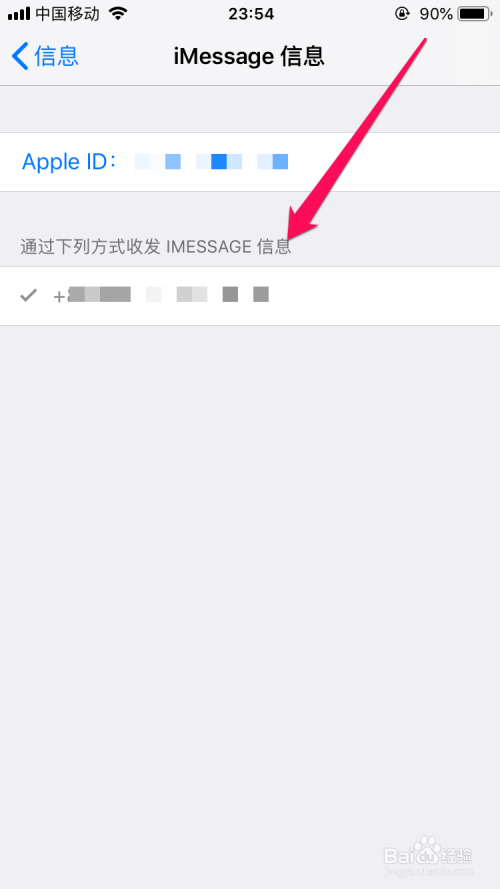 打开了iMessage信息的界面选项中显示Apple ID与本机的号码选项,然而在经由过程下列体例收发iMEASSAGE选项栏把不需要的邮箱勾拔取消失落(在这没有添加任何的邮箱,所以在这没有邮箱选项)。