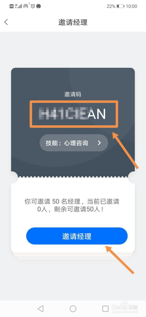 然后系统会为我们随机生当作一个邀请码,我们可以将邀请码分享给其他人,被我们邀请的人会当作为我们的司理,点击【邀请司理】。