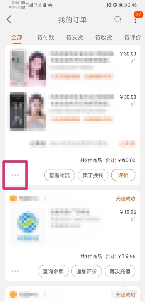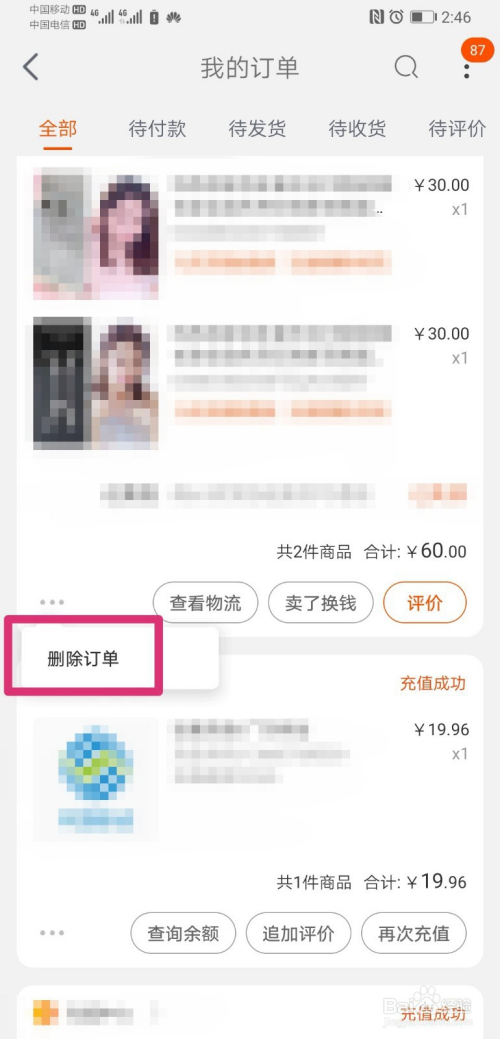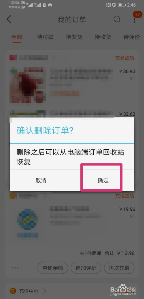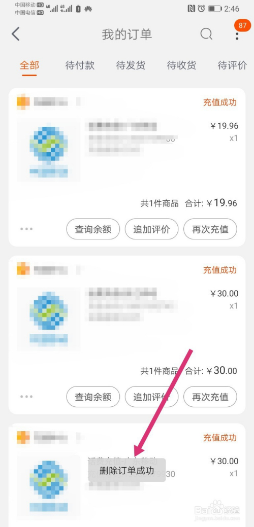 进入我的认单界面,找到需要删除的采办记实,然后点击记实左下角的删除订单;