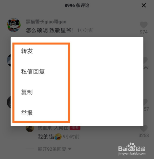 删除操作只能操作本身的,若是是他人的评论的话,我们点长按之后会呈现下图所示的,有转发复制和举报等。