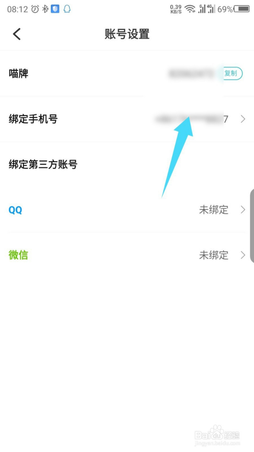 在打开的账号设置页面,能看到绑定的手机号选项,点击一下。如图所示