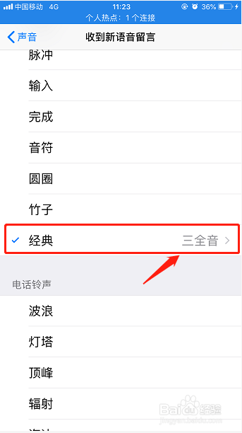 在声音界面滑动屏幕到下面找到“收到新语音留言”点击进入,在提醒铃声中按照本身的爱好设置就可以了。