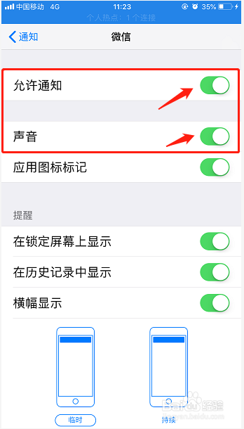 在通知里面找到“微信”在通知下面把“许可通知和声音后面的按钮打开”;