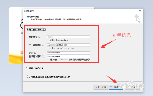 在添加新帐户页面,按照现实环境填写上相关资料后点击下一步。