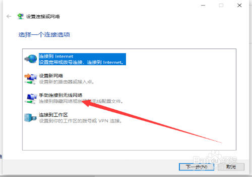 打开设置毗连或收集的窗口中列表中单击【手动毗连到无线收集】选项再单击下一步按钮。