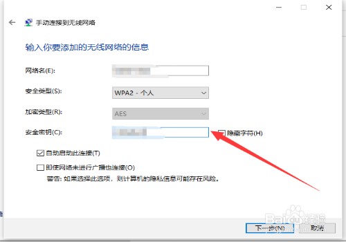 切换到输入你要添加的无线收集的信息的对话框中输入【埋没无线收集名称和密码】之后再单击下一步按钮。