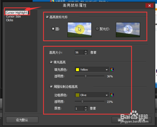 点击 CUrsor Highlight,设置高亮鼠标属性: