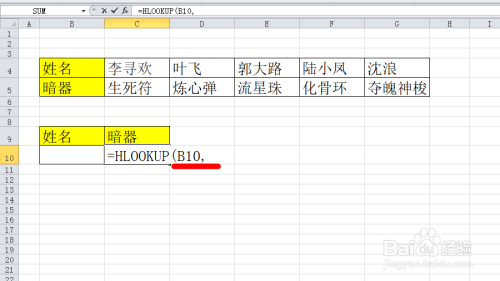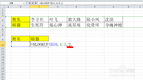 完整公式“=HLOOKUP(B10,4:5,2,0)”,在B10单位格输入想查询的人物姓名,C10单位格就会显示人物利用暗器名称。