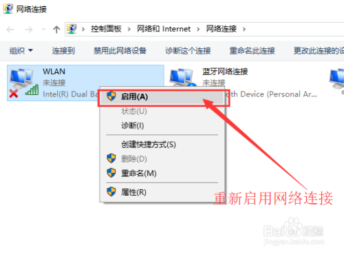 在打开的收集毗连界面中,找到无线毗连“WLAN”,右键单击,并选择“禁用”,然后会看到WLAN会酿成灰色,申明已被禁用。最后我们来重启它,右键单击它,选择“启用”,这样一来,无线收集就会从头获取IP地址,可以等个几秒钟,看看是否能毗连正常。