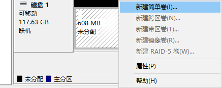 之后回到“磁盘办理”右击未分派的磁盘,选择“新建简单页”