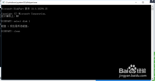 输入 select disk 1,选择节制面板所示磁盘,确认是否磁盘 1,确认无误后,输入clean回车即可