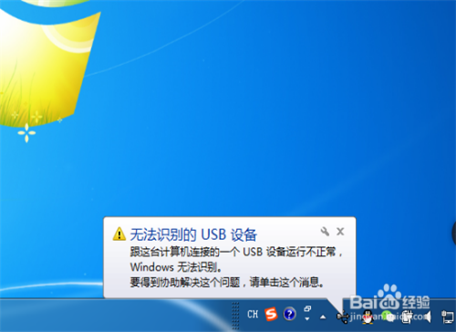 插上usb鼠标,在右下角显示【无法识此外usb设备】。