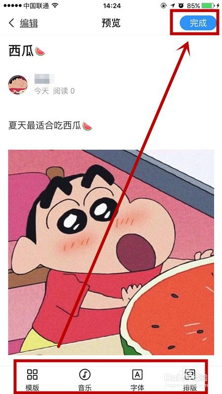 在预览页面,点击下方的模板/音乐/字体/排版,找到一个最适合文章气概,所有的都处置好后点击右上角的完当作即可发布。