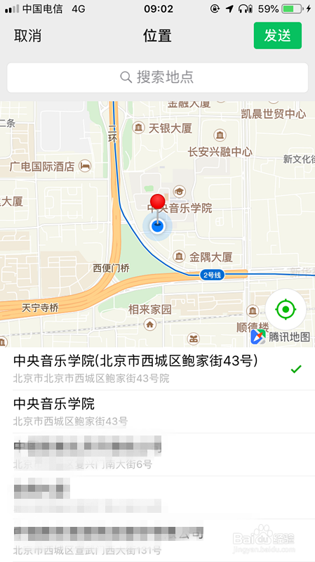 点击发送位置后,会呈现地图界面。在此界面选择本身最切确的位置,点击右上角的发送按钮;