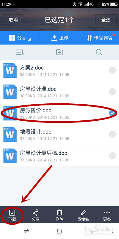 在文件列表中,按照路径找到要下载的文档后,长按选中,单击页面左下角的“下载”