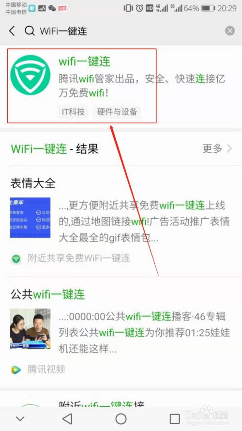 然后在搜刮输入框内输入“WiFi一键连”,并点击搜刮成果,进入小程序。