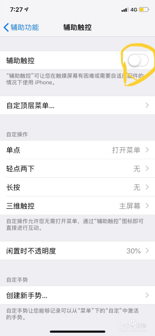 在辅助触控键后有个开关,此时开关呈灰色封闭状况,点击开关