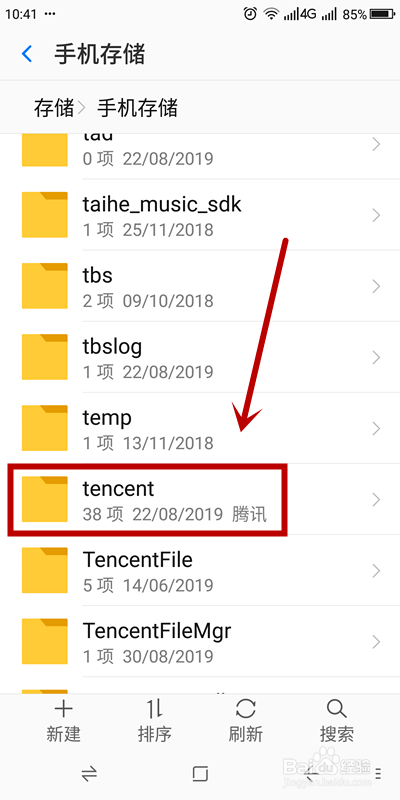 在”手机存储“页面,文件浩繁,上滑屏幕,找到名为“tencent”的文件夹