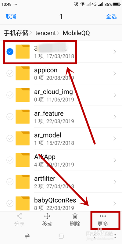 进入该文件夹后,在文档中找到以本身的QQ号码定名的文件夹选中并长按该文件夹,直到左侧呈现蓝色打勾