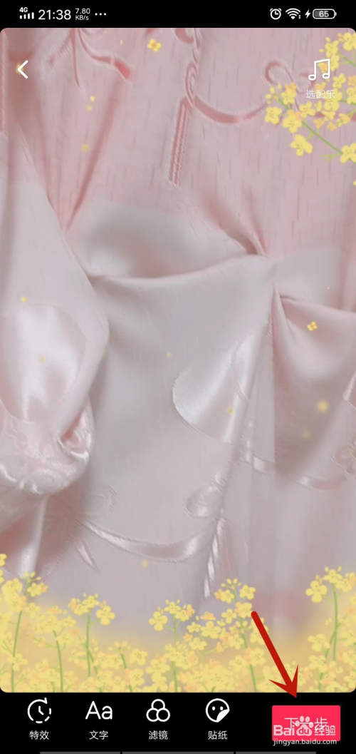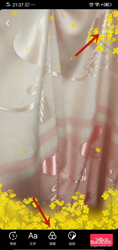 然后我们可以来到这个界面,对拍摄好的视频编纂,右上方可以添加音乐,本家儿要下面的滤镜对画面的美不雅很主要,点击一下,如图所示。
