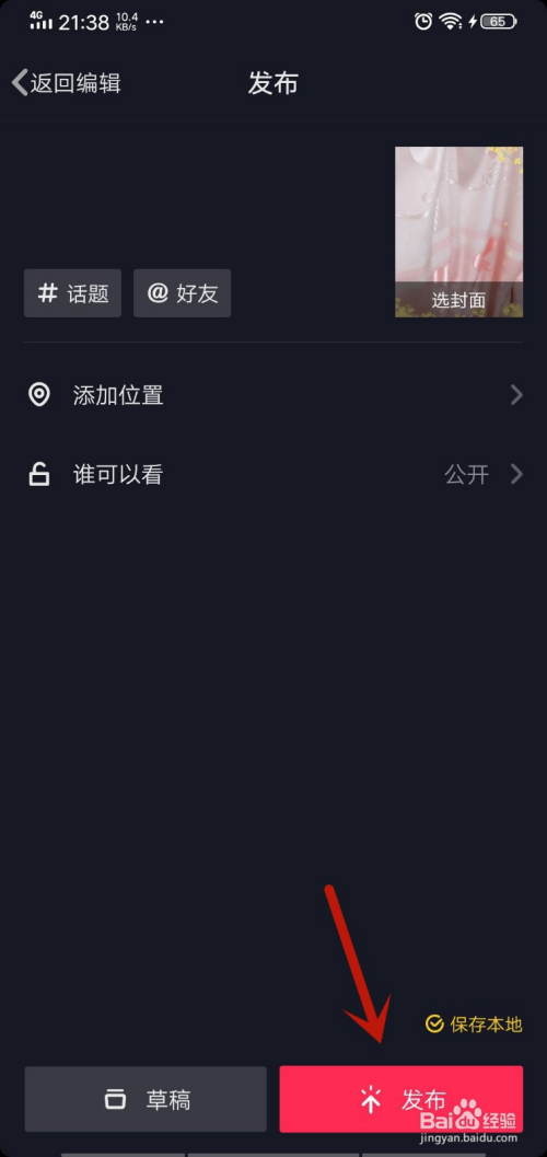 最后我们将拍摄好的视频点击【发布】,直接发布出去,或者保留草稿,我们就拍都雅视频完当作,如图所示。