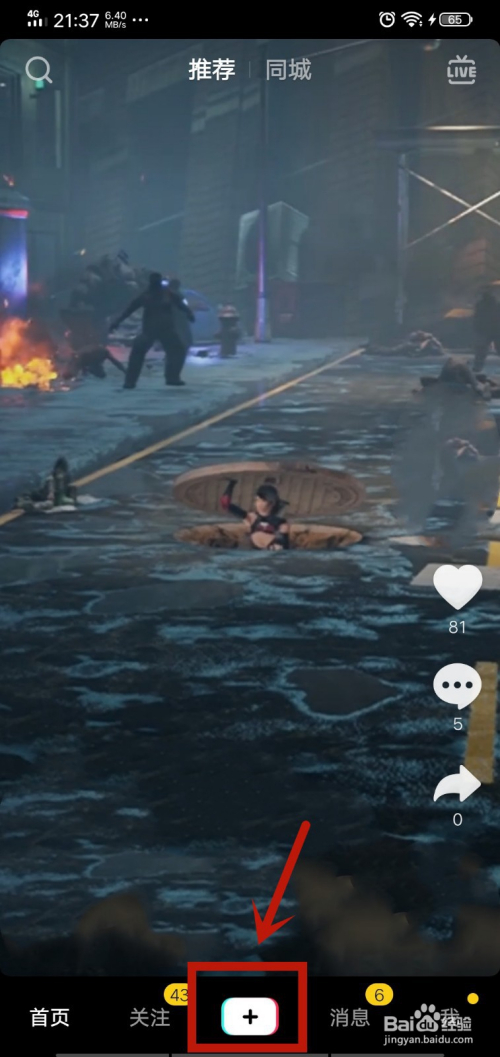1、在抖音傍边,点击下面的【+】按钮