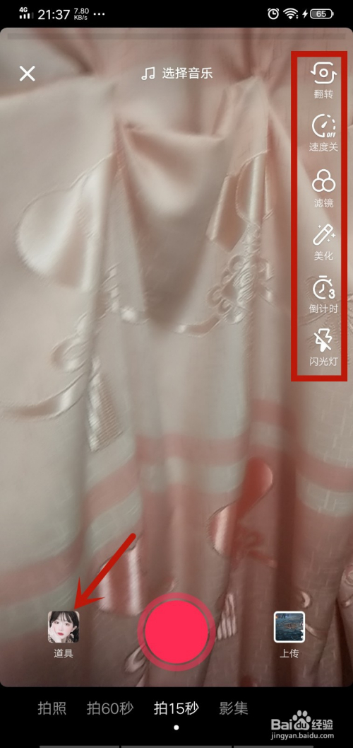 然后在里面经由过程左侧的功能,对视频简单的美化一下,这里本家儿要需要点击【道具】,这是我们拍好视频常用的东西,如图所示。