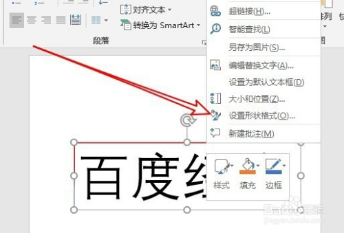 右键点击选中要编纂的幻灯片文本框,在弹出菜单中选择设置外形格局的菜单项。
